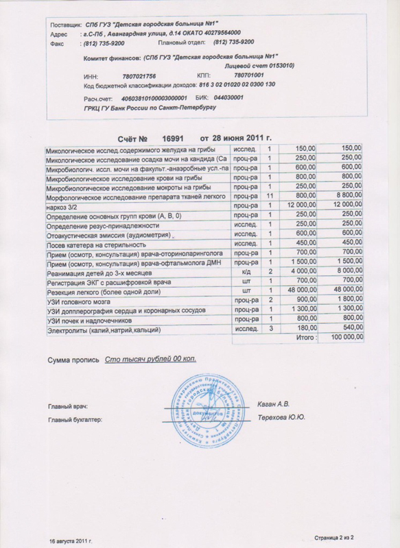 Феденька родился 7 июня, через сутки его прооперировали в Детской городской больнице №1, где ему сделали операцию по удалению нижней части левого легкого. Поскольку Федя - иногородний, операция оказалась платной, и, значит, в Городской больнице СПб все платно.